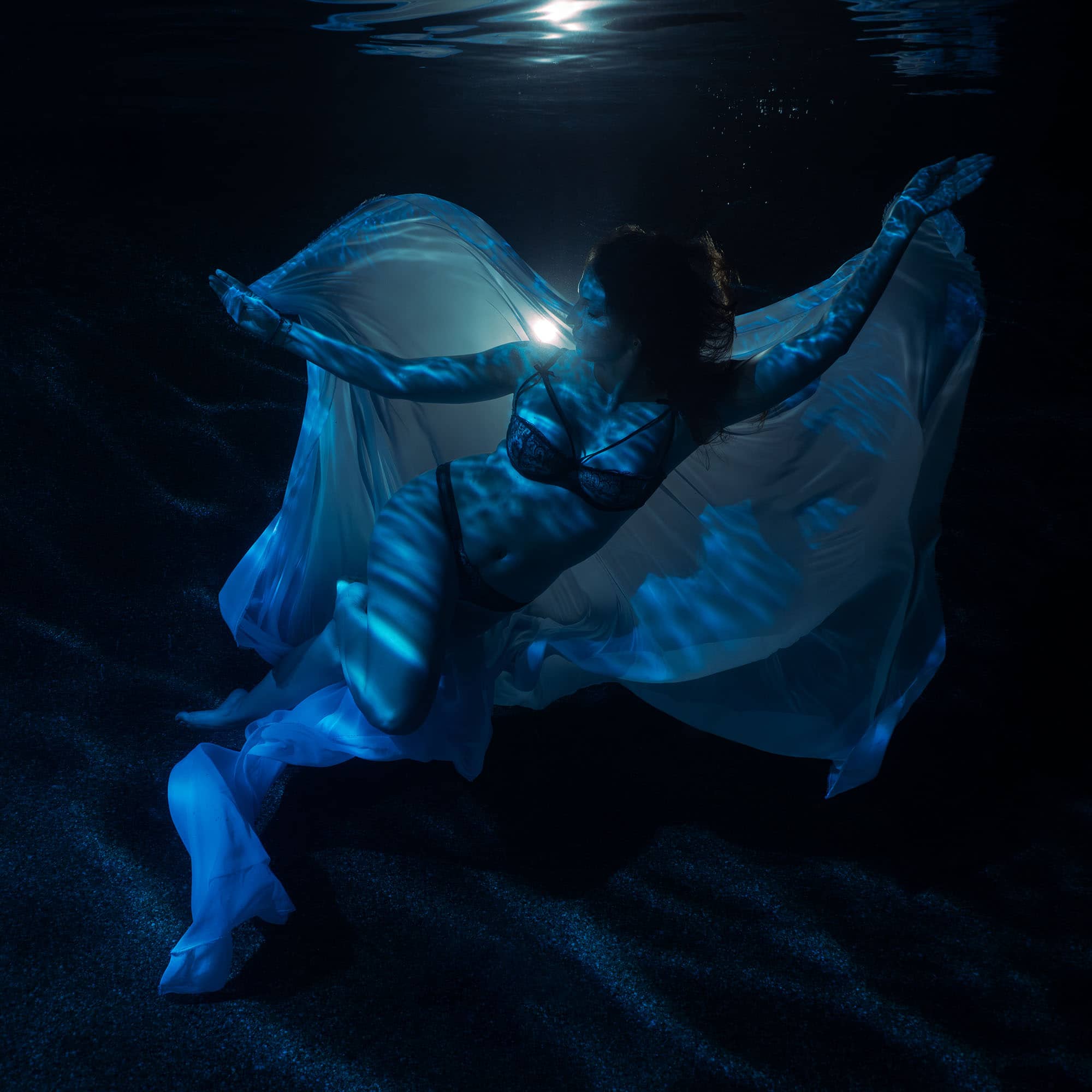 Light, flowing fabrics like chiffon or organza work beautifully underwater. Swimwear, bodysuits, or lingerie are also perfect. Avoid heavy fabrics that may drag you down. I also shoot nudes and implied nudes.